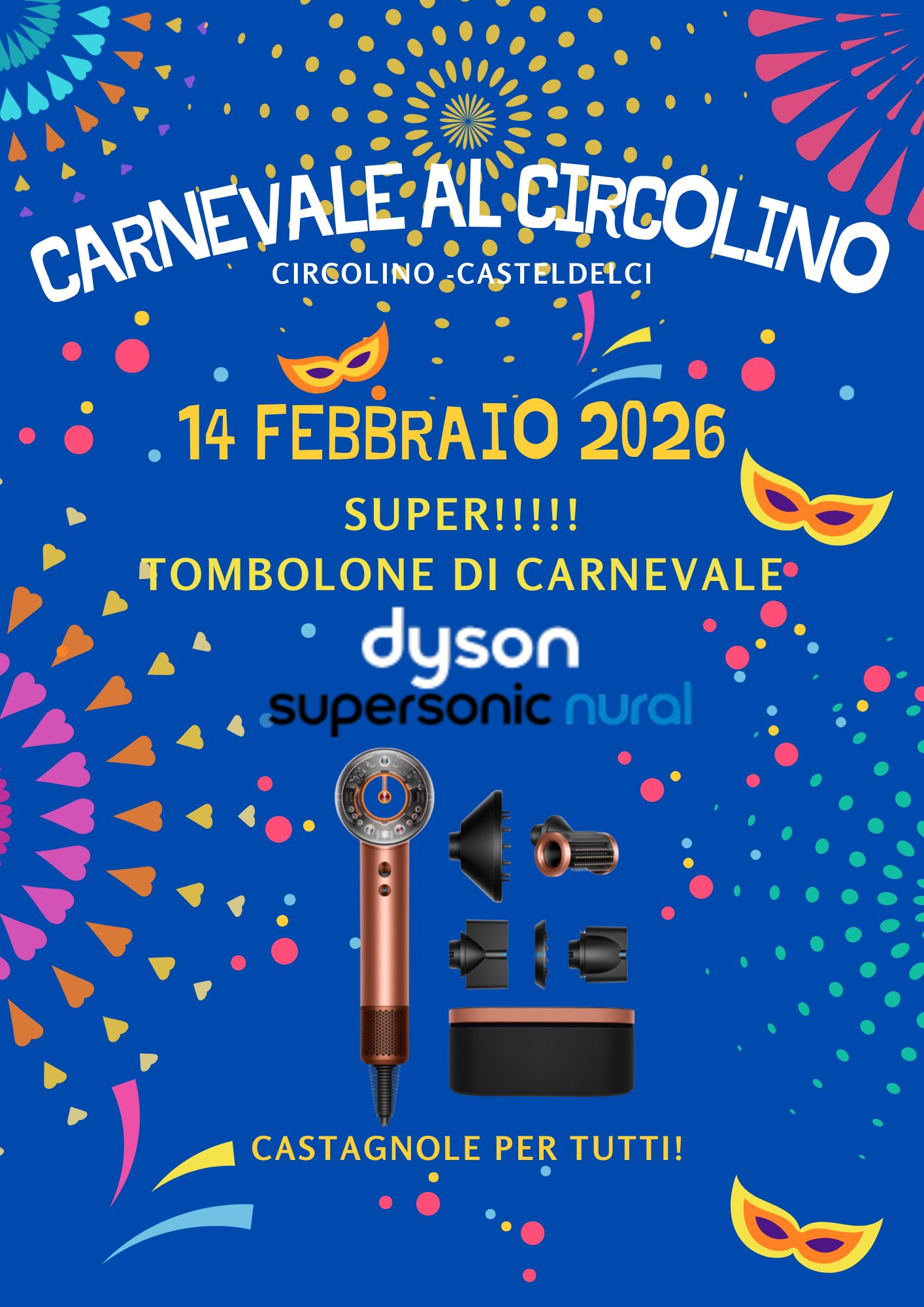 Condividi Contenuto intro Argomenti Tempo libero Sabato 14 e domenica 15 febbraio si festeggia il Carnevale al Circolino di Casteldelci Cos'è Tipo di evento Enogastronomico CARNEVALE AL CIRCOLINO Il Carnevale sta arrivando a Circolino di Casteldelci! 14 febbraio | dalle 20:30 Tombolone di Carnevale In palio un esclusivo asciugacapelli Dyson Supersonic Nural 15 febbraio | dalle 15:30 Carnevale dei bambini: Franco Baldoni - "Ti racconto una storia con il kamishibai" Musica Animazione Merenda Con castagnole per tutti! Vi aspettiamo in maschera per due giorni di allegria, musica e divertimento Date e orari Data e ora di inizio Sab, 14/02/2026 - 20:30 Data e ora di fine Dom, 15/02/2026 - 21:00 A chi è rivolto A tutta la cittadinanza Costi Ingresso gratuito Immagini Contatti Tel. Comune Read more about Tel. Comune 0541 915423