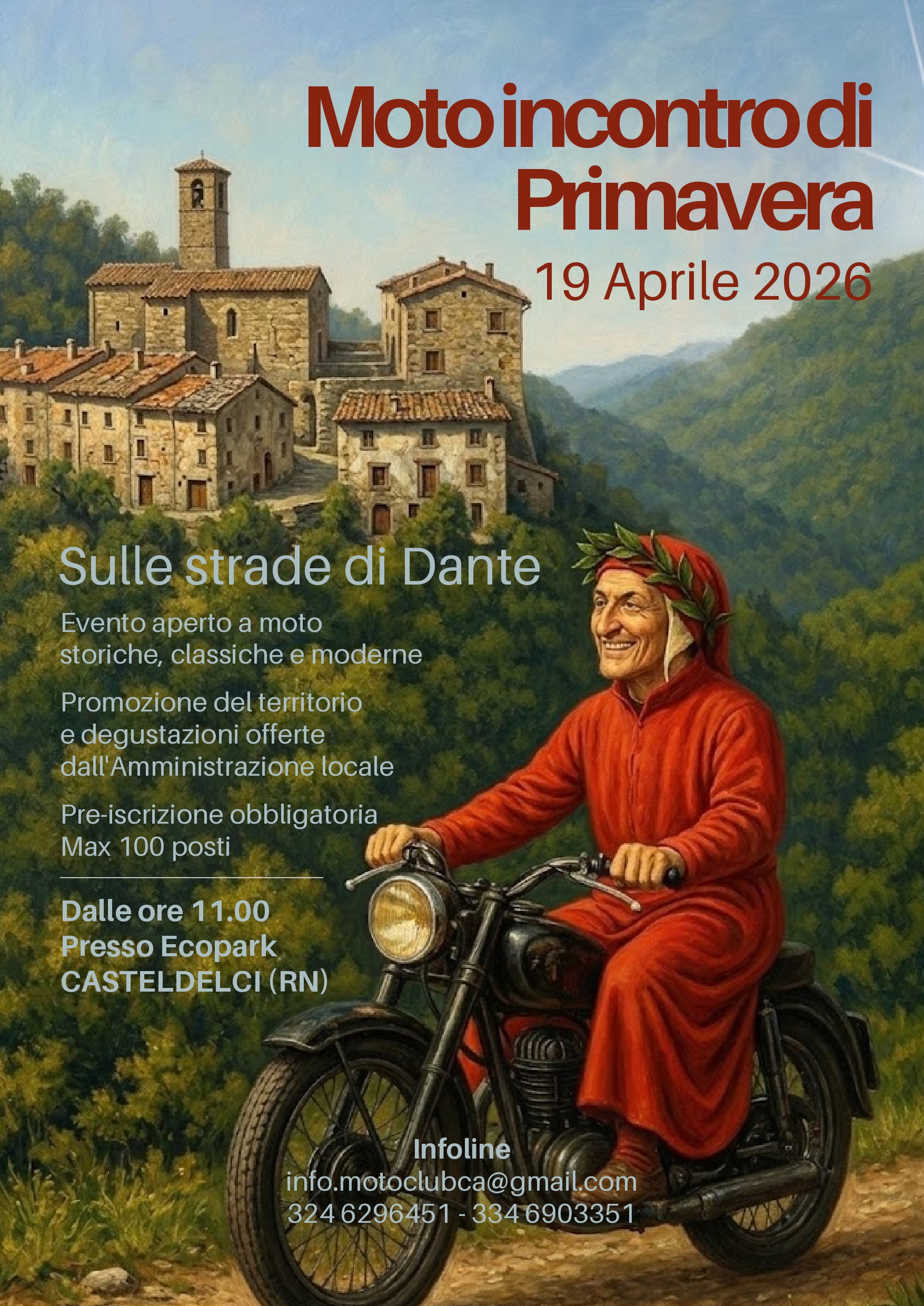 Condividi Contenuto intro Argomenti Turismo MotoIncontro di Primavera, una giornata perfetta per vivere la passione per le moto, scoprire nuove strade e condividere l’atmosfera unica della primavera tra amici e motori. Cos'è Tipo di evento Raduno sportivo Moto Incontro di Primavera – Sulle strade di Dante Il 19 aprile 2026, un evento dedicato a tutti gli appassionati delle due ruote che vogliono vivere una giornata tra motori, natura e cultura lungo i suggestivi percorsi legati a Dante Alighieri. L’incontro si svolgerà presso l’Ecopark di Casteldelci (RN) con ritrovo a partire dalle ore 11:00. L’evento è aperto a moto storiche, classiche e moderne, offrendo un’occasione unica per condividere la passione per il motociclismo e scoprire il territorio dell’Alta Valmarecchia. L’iniziativa vuole valorizzare il territorio locale attraverso momenti di convivialità e degustazioni offerte dall’amministrazione locale. Pre-iscrizione obbligatoria, posti limitati: massimo 100 partecipanti Per info e iscrizioni: info.motoclubca@gmail.com 324 6296451 – 334 6903351 Date e orari Data e ora di inizio Dom, 19/04/2026 - 11:00 Data e ora di fine Dom, 19/04/2026 - 21:00 A chi è rivolto Tutta la popolazione e appassionati di motociclismo. Luogo Eco Park Costi Gratuito Immagini Contatti Tel. Comune Read more about Tel. Comune 0541 915423
